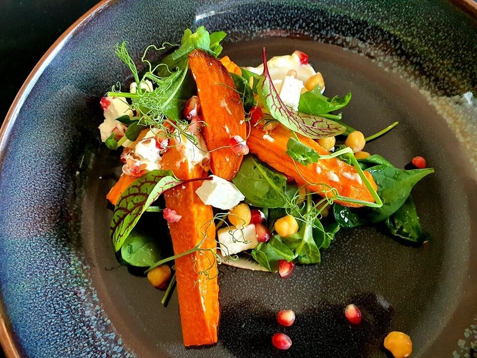 Roladka z piersi z kurczaka w szynce parmeńskiej z puree z batata i surówką z brukselki